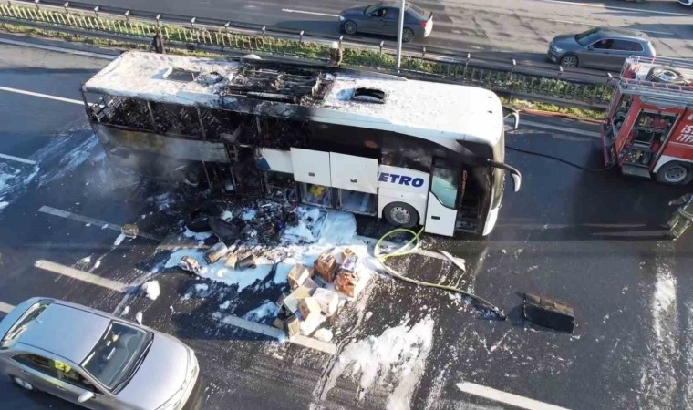 Adana’dan yola çıkan şehirlerarası yolcu otobüsü, İstanbul Esenler’de seyir halindeyken bir anda yanmaya başladı. Alevlerin yükseldiği otobüsten tahliye edilen 25 kişi ölümden dönerken, yangın itfaiye ekipleri tarafından söndürüldü. Yangın nedeniyle trafikte oluşan yoğunluk dron ile görüntülendi.