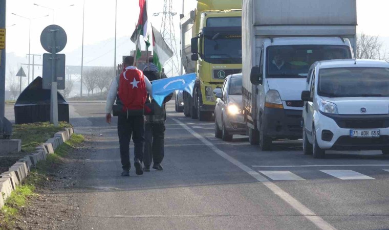 Dünyadaki tüm masum ve mazlumlar için yürüdüklerini ifade eden İsmail Tiryaki, “Bu yolculuğumuz İstanbul’dan katil, terörist İsrail’in konsolosluğuna çelenk bırakmayla başladı. 7 gündür yoldayız. Dünyadaki mazlumlar ve mağdurlar için yürüyoruz. Dünyanın gözünü kapadığı, kulağını tıkadığı Filistin için vicdanlı insanların bu davaya gönül verdiklerini görüyoruz. Biz de o gönül verenlerle beraberiz, Ankara Kızılay meydanına kadar yürüyeceğiz. Orada açıklamamızı yapıp bu hedefimizi sonlandıracağız” dedi.