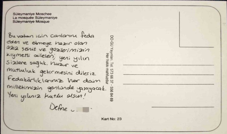 Yeni yıl öncesi İstanbul’da özel bir lisenin 10. sınıfında okuyan 12 öğrenci Manisa’daki şehit aileleri ve gazilere hem moral verdi hem de duygulandırdı. Elif Gökçe Güneşli isimli öğrencinin önderliğinde biraraya gelen liseli öğrenciler, kendi duygu ve düşüncelerinden oluşan satırlarla hazırladıkları yeni yıl tebrik kartlarında şehitlerin ve gazilerin vatan ve millet için gösterdikleri fedakarlıkları asla unutmayacaklarını ifade etti.