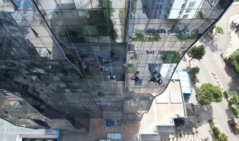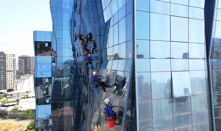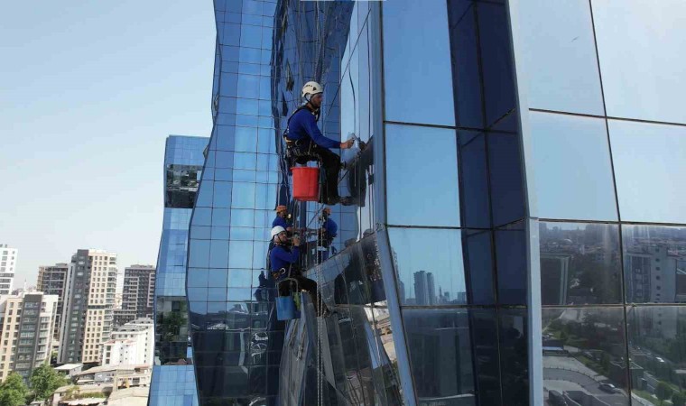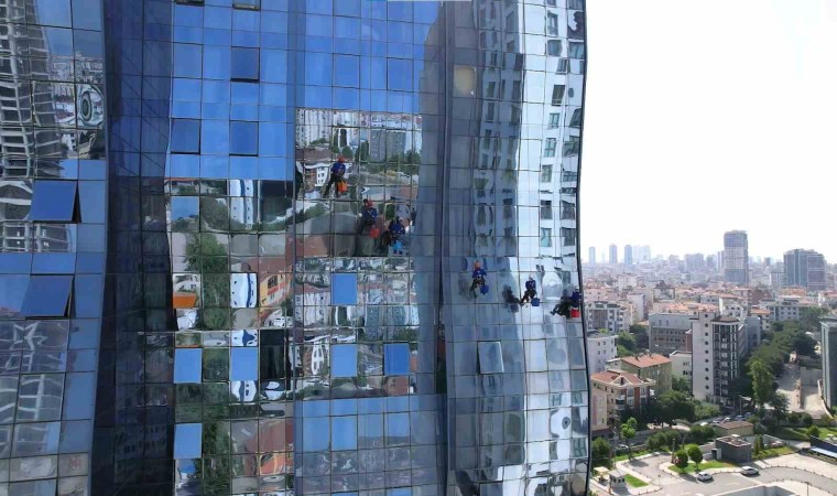 Mega kent İstanbul’da bulunan gökdelen, rezidans ve büyük yapıların temizliğinde yer alan iple erişim teknisyenleri dron ile görüntülendi.