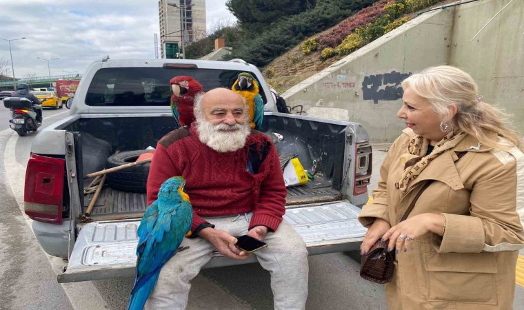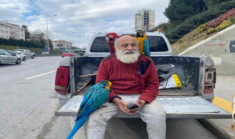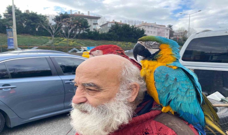 İstanbul’un Beykoz ilçesinde omzunda papağanlarıyla gezen İsmail Karamustafa (70), vatandaşların ilgi odağı oldu.