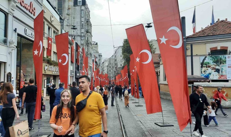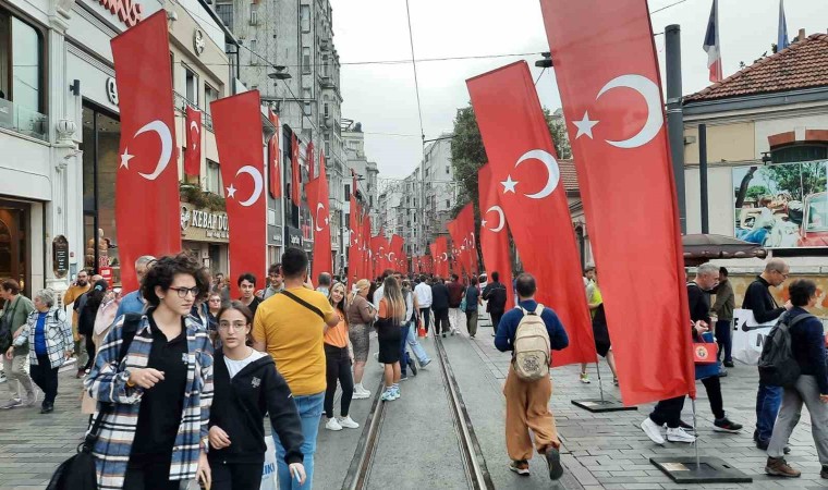 Beyoğlu İstiklal Caddesi, Cumhuriyet’in 100’üncü yıldönümü kutlamaları kapsamında Türk bayrakları ile donatıldı. Beyoğlu Belediyesi ekipleri tarafından caddeye platformlar üzerinde Türk bayrakları yerleştirildi. Bin 400 metre uzunluğunda, yaklaşık 2 metrelik aralıklarla çift taraflı bin 200 adet konumlandırılan bayraklar, çevredekilerin de ilgisini çekti. Caddeyi gezmek için gelenler, bayrakların önünde fotoğraf çektirmeyi ihmal etmedi.