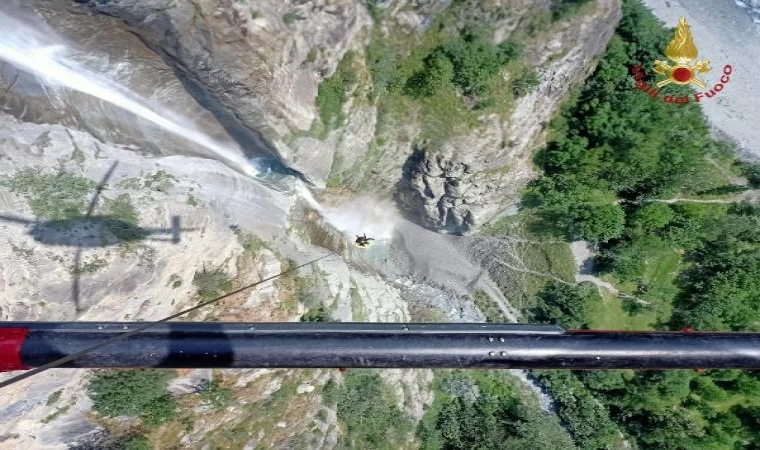 Olay, İtalya’nın Turin kentinin batısında, Susa Vadisi’nde 14 Temmuz’da meydana geldi. Susa Vadisi’nde Rio Claretto şelalesinin açtığı yarıktan iniş yapmaya çalışan iki dağcı mahsur kaldı. İtalyan itfaiyesi Vigili del Fuoco, bölgeye helikopterle intikal etti. Görüntülerde, itfaiye personelinin çelik halatla dağcıların bulunduğu noktaya iniş yaptığı ve dağcıları helikoptere çektiği anlar yer aldı.