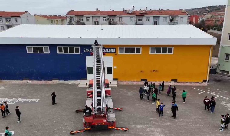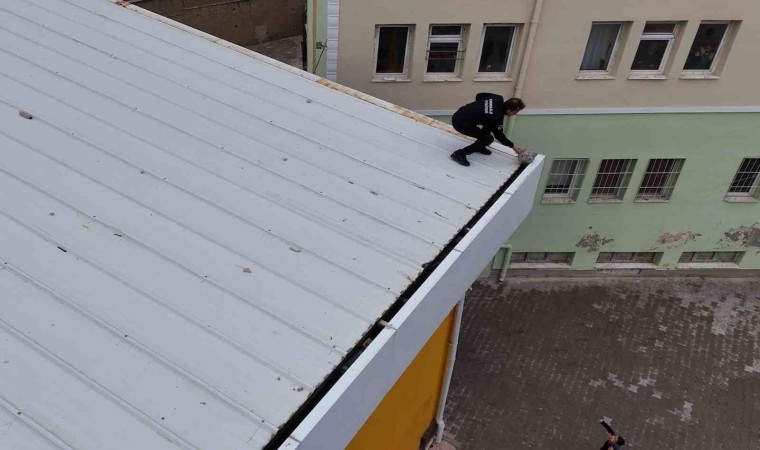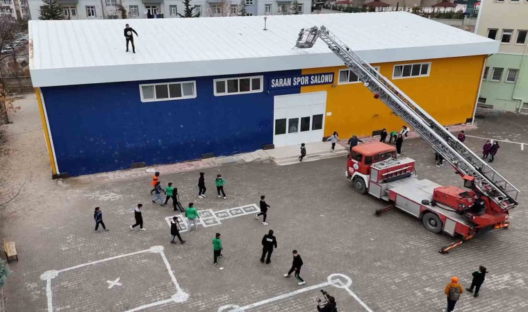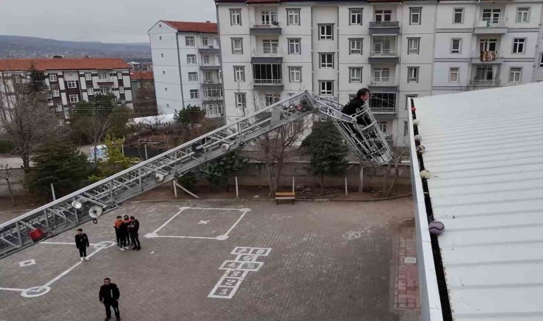 Kırıkkale’de itfaiye ekipleri, spor salonu çatısına kaçan topları öğrencilere teslim ederek yüzleri güldürdü.