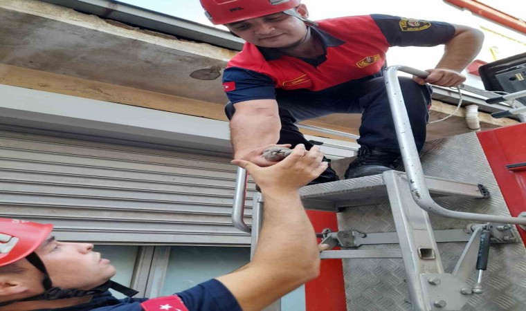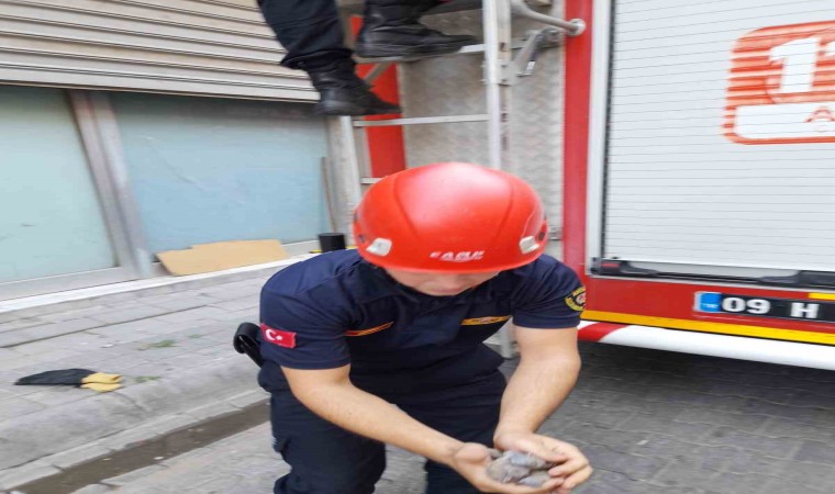 Aydın’ın Efeler ilçesinde bir binanın üçüncü katında cam kenarına sıkışan kumru yavrusu, itfaiye ekipleri tarafından kurtarıldı.