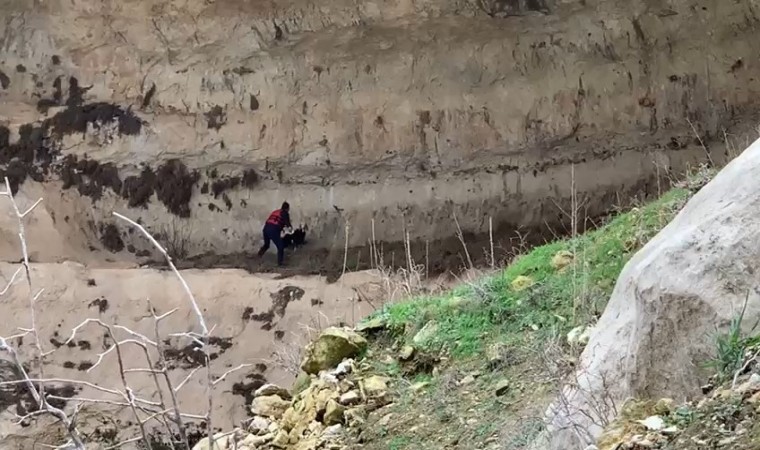Batman’da itfaiye eri, kayalıklarda mahsur kalan keçiyi sırtında taşıyarak aşağı indirdi.