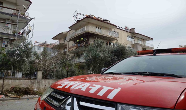 Aydın’ın Efeler ilçesinde bir evin balkonunda çıkan yangını itfaiye ekipleri söndürmeye çalışırken, o anları karşı apartmanın çatısındaki işçi tehlikeye aldırış etmeden izledi.