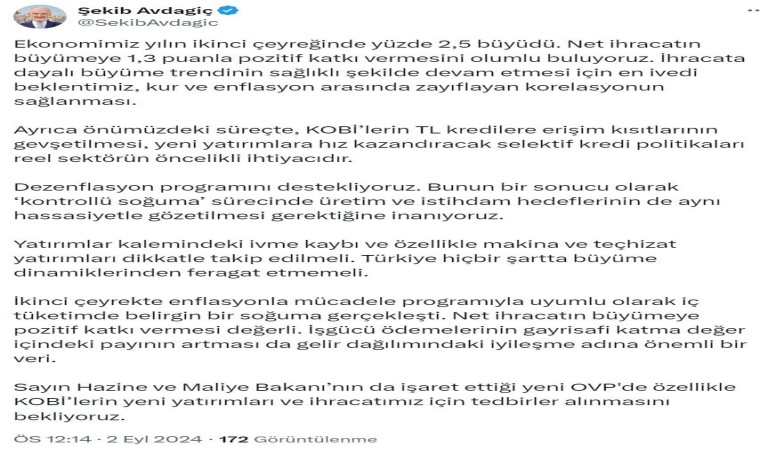 İstanbul Ticaret Odası (İTO) Başkanı Şekib Avdagiç, sosyal medya hesabından yaptığı açıklamada Türkiye ekonomisinin yılın ikinci çeyreğinde yüzde 2,5 büyümesine ilişkin değerlendirmelerde bulundu.