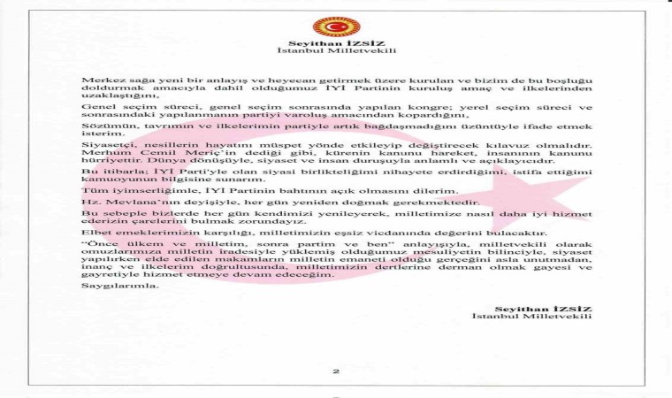"Merkez sağa yeni bir anlayış ve heyecan getirmek üzere kurulan ve bizim de bu boşluğu doldurmak amacıyla dahil olduğumuz İYİ Parti’nin kuruluş amacı ve ilkelerinden uzaklaşması, genel seçim süreci, genel seçim sonrasında yapılan kongre; yerel seçim süreci ve sonrasındaki yapılanmanın partiyi varoluş amacından kopardığını, sözümün, tavrımın ve ilkelerimin partiyle artık bağdaşmadığını üzüntüyle ifade etmek isterim."