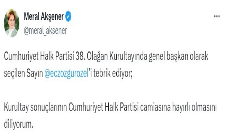 İYİ Parti Genel Başkanı Meral Akşener, CHP Genel Başkanı seçilen Özgür Özel’i tebrik etti. Akşener X sosyal medya hesabından yaptığı paylaşımda şu ifadelere yer verdi: