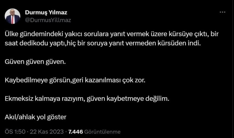 10 Kasım’da İYİ Parti’den istifa eden Ankara Milletvekili ve eski Türkiye Cumhuriyet Merkez Başkanı Durmuş Yılmaz, İYİ Parti Genel Başkanı Meral Akşener’in TBMM’de partisinin grup toplantısında yaptığı konuşmayı eleştirdi. Yılmaz, sosyal medya hesabından yaptığı açıklamada, "Ülke gündemindeki yakıcı sorulara yanıt vermek üzere kürsüye çıktı, bir saat dedikodu yaptı, hiçbir soruya yanıt vermeden kürsüden indi. Güven, güven, güven. Kaybedilmeye görsün, geri kazanılması çok zor. Ekmeksiz kalmaya razıyım, güven kaybetmeye değilim. Akıl/ahlak yol göster" ifadelerini kullandı.
