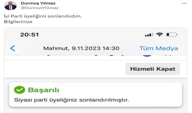 İYİ Partili eski Merkez Bankası Başkanı Durmuş Yılmaz, X sosyal medya hesabından yaptığı paylaşımda İYİ Parti’den istifa ettiğini açıkladı. Yılmaz, fotoğraflı paylaşımında, “İYİ Parti üyeliğimi sonlandırdım, bilgilerinize” ifadesini kullandı.