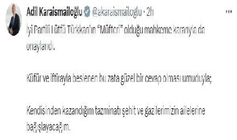 Karaismailoğlu, Twitter'daki hesabından yaptığı açıklamada, "İYİ Partili Lütfü Türkkan'ın müfteri olduğu mahkeme kararıyla da onaylandı. Küfür ve iftirayla beslenen bu zata güzel bir cevap olması umuduyla; kendisinden kazandığım tazminatı şehit ve gazilerimizin ailelerine bağışlayacağım" dedi. (DHA)