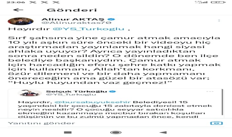 Geçmiş yıllarda seyyar satıcı bir çocuğun zabıta memurları tarafından uzaklaştırıldığı videonun altına, "Hayırdır @bursabüyükşehir Belediyesi! 15 yaşındaki bir çocuğu 15 zabıta memuruyla derdest etmek neyin nesidir? O çocuğu seyyar satıcılıkla ekmeğini kazanmaya mecbur bırakan şartları düşünün ve bu zulmü yapmadan önce kendi çocuğunuzu onun yerine bir koyun! Ayıptır ayıp, Allah’tan korkun!... Sn.@Alinuraktaş70, git bu çocuktan ve ailesinden özür dile, zabıtana da bu emri verenlere çeki düzen ver" şeklinde yorum yapıp sosyal medya hesaplarından paylaştı.