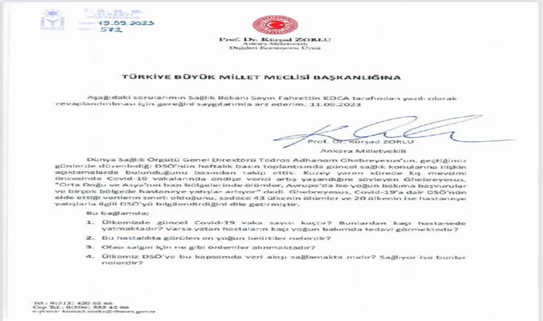 Rukiye MEYVECİ/ ANKARA, (DHA)- İYİ Parti Sözcüsü Kürşad Zorlu, koronavirüsün 'Eris' varyantı ile ilgili Sağlık Bakanı Fahrettin Koca'nın yanıtlaması için Türkiye Büyük Millet Meclisi'ne (TBMM) soru önergesi verdi.