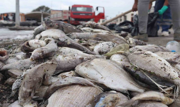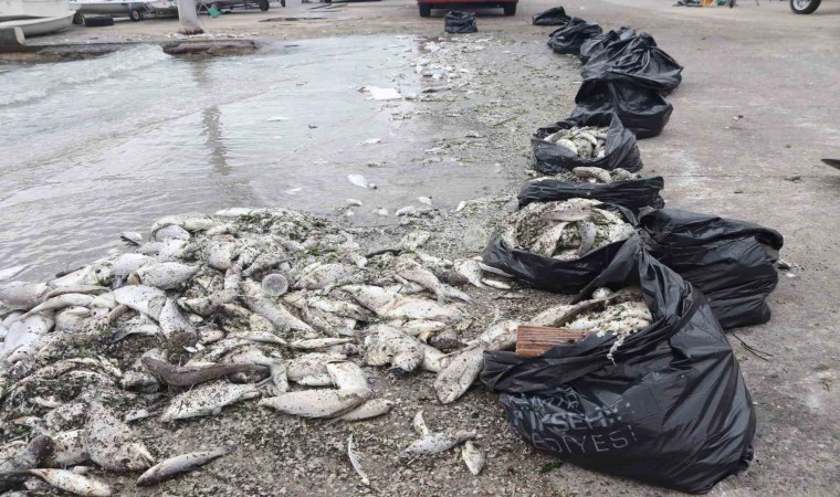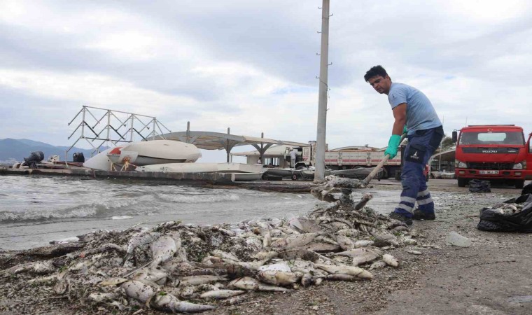 İzmir Büyükşehir Belediyesi ekipleri de kıyıya vuran ölü balıkların toplanması için çalışmalarını sürdürüyor.