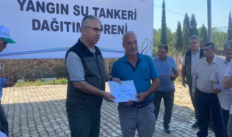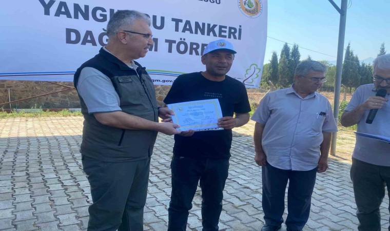 İzmir ve Manisalı muhtarlara İzmir Orman İşletme Müdürlüğü tarafından orman yangınlarını önlemek için basınçlı su atabilen su tankı teslim etti.