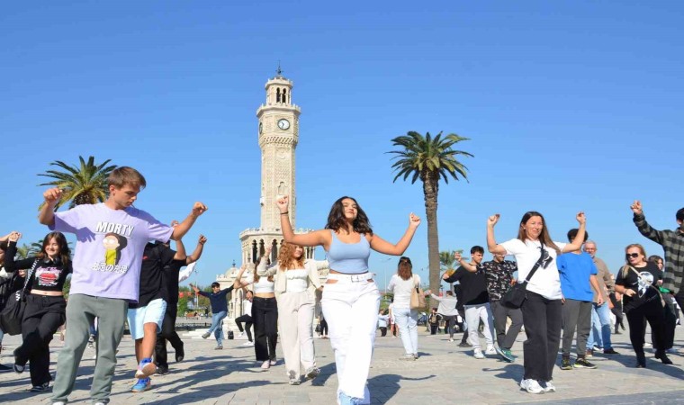 Cumhuriyetin 100. Yılı kutlamaları çerçevesinde İzmir İl Milli Eğitim Müdürlüğü tarafından gerçekleştirilen etkinlikte İzmirli vatandaşlar Konak Meydanı’nda bir araya geldi ve karşılıklı zeybek oynadı.