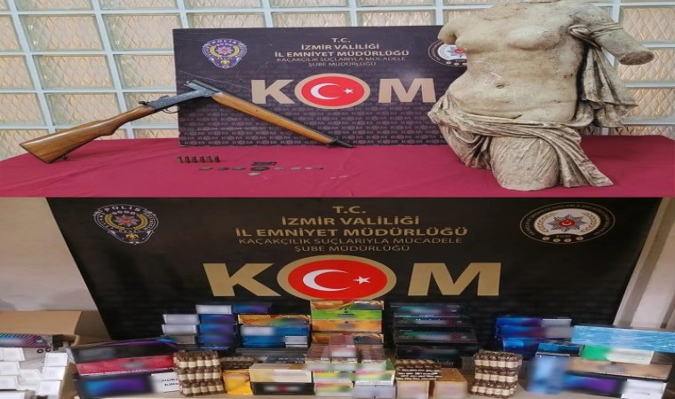 İzmir İl Emniyet Müdürlüğü Kaçakçılık Suçlarıyla Mücadele Şube Müdürlüğü ekipleri, 8-14 Eylül tarihleri arasında kent genelinde 17 ayrı operasyon gerçekleştirdi. Bayraklı, Buca, Bornova, Konak, Narlıdere, Torbalı, Aliağa ve Ödemiş ilçelerinde 5 iş yeri, 5 ikamet, 3 depo, 3 araç, 1 kargo gönderisinde ve otogarda yapılan aramalarda 229 bin 580 adet içi doldurulmuş makaron, 65,8 ton kaçak akaryakıt ürünü, 44 bin adet boş makaron, 17 bin 320 adet sigara kağıdı, 4 bin 12 paket gümrük kaçağı sigara, 1,5 ton etil alkol, 815 adet puro, 756 adet elektronik sigara cihazı, 231 kilogram kıyılmış tütün, 20 şişe muhtelif içki, 11 adet sikke, 1 adet mermerden yapılmış başsız kadın heykeli, 1 adet gümrük kaçağı otomobil, 1 adet av tüfeği, 6 adet tabanca mermisi ele geçirildi. Olaylarla ilgili 19 şüpheli hakkında işlem gerçekleştirildi.