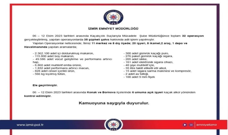 İzmir Emniyet Müdürlüğü Kaçakçılık Suçlarıyla Mücadele Şube Müdürlüğü ekiplerince, 6-12 Ekim tarihlerinde 19 ilçede 32 ayrı kaçakçılık operasyonları gerçekleştirildi. 35 şüpheli şahsa adli işlem uygulanırken, 20 iş yeri, 8 ikamet, 2 araç, 1 depo ve havalimanında aramalar yapıldı.