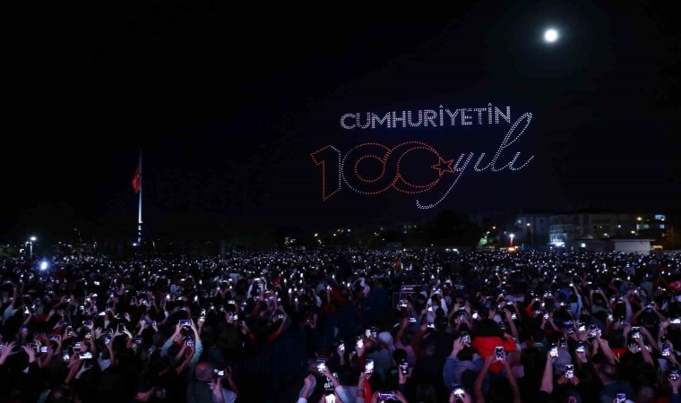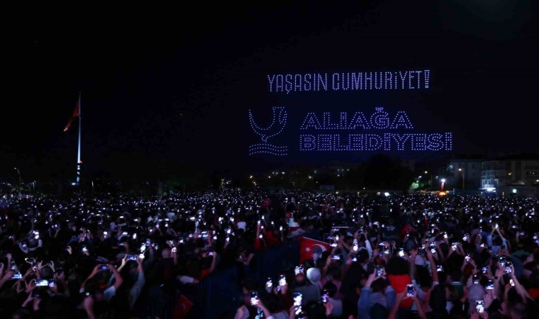 İzmir’in Aliağa ilçesinde, Cumhuriyetin 100. yılı etkinlikleri çerçevesinde yapılan dron gösterisi damga vururken, gökyüzüne; Türk Bayrağı, 100. yıl logosu, 29 Ekim 1923, Türkiye Büyük Millet Meclisi, Türkiye haritası, Aliağa Belediyesi ve Atatürk silüetleri çizildi.