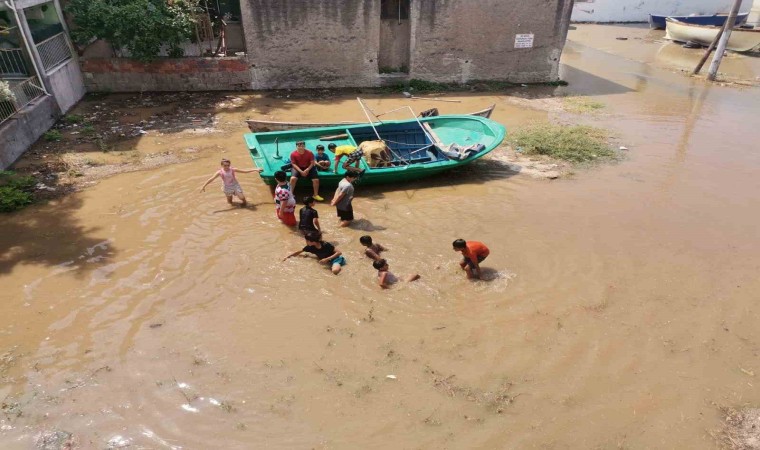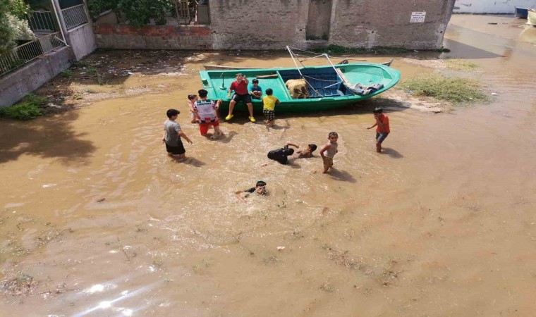İzmir’in Karşıyaka ilçesinde yapılan kazı çalışması esnasında ana su borusu patladı. Çocuklar boş bir arsaya dolan su da yüzerken, sokaklar göle döndü, çok sayıda evi su bastı.