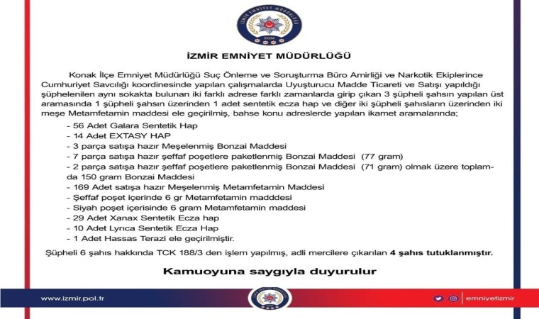 Konak İlçe Emniyet Müdürlüğü Suç Önleme ve Soruşturma Büro Amirliği ve Narkotik ekipleri, Cumhuriyet Savcılığı koordinesinde yapılan çalışmalarda, “Uyuşturucu Madde Ticareti ve Satışı” yaptığından şüphelendikleri şahsın ayını sokakta bulunan iki farklı adresine girip çıkan 3 şüpheliyi tespit etti. Şahısların yapılan üst aramalarında; şüphelilerden birisinin üzerinden sentetik hap, diğer iki şahsın üzerinden ise metamfetamin maddesi ele geçirildi.