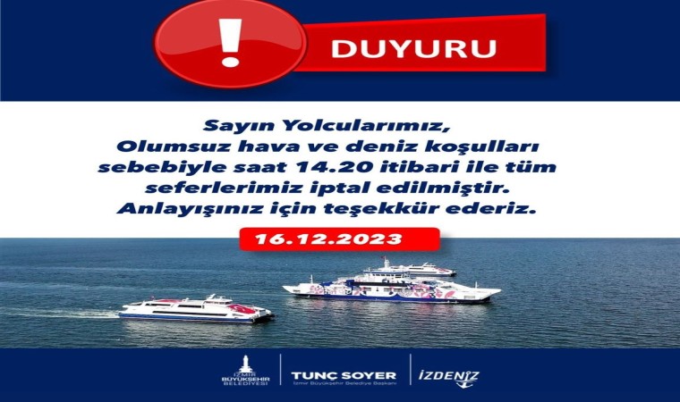 İzmir’de sağanak yağış ve olumsuz hava şartları nedeniyle, saat 14.20’den itibaren tüm deniz seferlerinin iptal edildiği açıklandı. İzdeniz’in sosyal medya hesabından yaptığı açıklamada, "Olumsuz hava ve deniz şartları sebebiyle saat 14.20’den itibari ile tüm seferlerimiz iptal edilmiştir. Anlayışınız için teşekkür ederiz" sözlerine yer verildi.