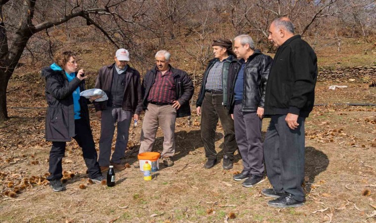 İzmir Büyükşehir Belediyesi Tarımsal Hizmetler Dairesi Başkanlığı’nda görevli Ziraat Mühendisi Dr. Elvan Hatipoğlu, kestane kanserinin son dönemlerde hızla yayıldığını belirterek “Bu çalışmaya 2018 yılında başladık. Üreticilerimize ardıç katranı, bordo bulamacı ve sodyum hipoklorit desteği veriyoruz. İlk sene büyük dal budama makasları, testere gibi yardımlarımız da oldu. Bunlarla beraber kestane kanseri ile nasıl mücadele edileceğiyle ilgili eğitimler verdik. Öncelikle hastalıklı dokunun altından beyaz doku görünene kadar temizliğinin yapılması, ardından üç birim ardıç katranı ile bir birim göztaşını karıştırıp macun haline getirerek, budama sonrası temizlenen açık yaralara sürülmesi gerektiğini anlattık. Hastalıklı olan dalların kesilmesi sırasında kullanılan ekipmanın, başka bir ağaçta kullanılmadan önce sodyum hipoklorit ile dezenfekte edilmesi gerektiğinden bahsettik. Dönem dönem bu eğitimleri tekrarlıyoruz. Bu sene de hem dağıtım yapıyoruz hem bu eğitimleri tekrarlıyoruz” şeklinde konuştu.