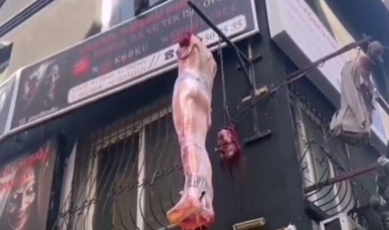 İzmir’de bir korku evinin reklam amaçlı astığı pano ve plastik mankenler tepki çekti. Sosyal medyada da tepki çeken görüntüler üzerine Alsancak semtinde bulunan korku evleri önündeki tasvirler, polis ve zabıta ekipleri tarafından kaldırıldı.