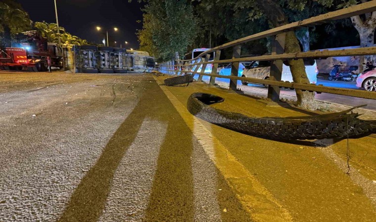 İzmir’in Bayraklı ilçesinde, seyir halindeyken lastikleri patlayan hafriyat kamyonunun refüje çarpması sonucu dorsesi devrildi. Dorsedeki mıcırlar yola savrulurken, yaralanan sürücü hastaneye kaldırıldı.