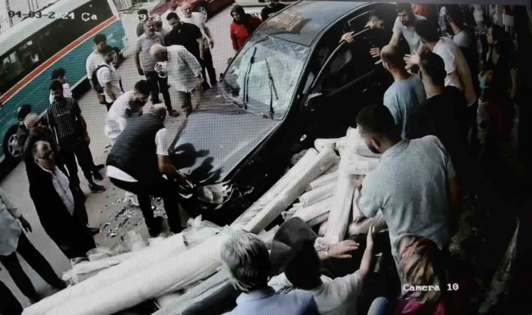 Feci kaza iş yerine ait güvenlik kamerasına da yansıdı. Görüntülerde kamyonete çarptıktan sonra savrulan otomobilin iş yeri önünde bulunan insanların arasına daldığı, dükkan önünde bulunan malzemeler ile insanların savrulduğu, kaza yapan araç sürücüsünün bir süre sonra baygınlık geçirdiği ve olay yerine çevredeki vatandaşların koştuğu, daha sonra ise ambulansın geldiği ve bacağında kırık olan yaralıya müdahale yaptığı görülüyor.