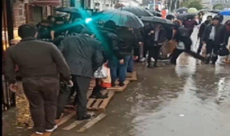 Basmane Gar çıkışında oluşan su birikintisi nedeniyle karşıya geçemeyen vatandaşlar ise çareyi tahtadan set yapmakta buldu. Set üzerinden tek tek geçen vatandaşlar, zorlukla yolun karşısına geçti.