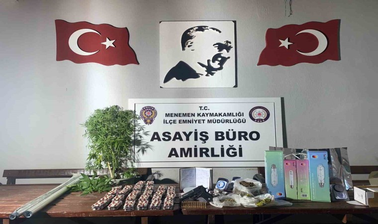 Menemen İlçe Emniyet Müdürlüğü Asayiş Büro Amirliği ekipleri, 9 Eylül Mahallesi’nde bulunan bir evde uyuşturucu imalatı ve ticareti yapıldığı bilgisi üzerine çalışma başlattı. Savcılık talimatıyla adrese gerçekleştirilen operasyonda, bin 435 adet yeşil reçeteye tabi sentetik ecza, 360 gram esrar, 86 gram esrar tohumu, saksı içerisinde 12 esrar bitkisi, bitkileri yetiştirmek için kullanılan ısı ve ışık sistemi ile 1 hassas terazi, 1 ruhsatsız tabanca, tabancaya ait şarjör ve 13 fişek ele geçirildi.