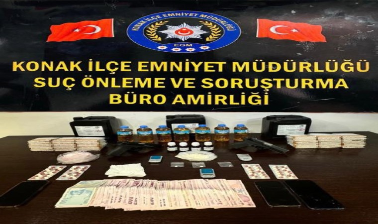 Konak İlçe Emniyet Müdürlüğü Suç Önleme ve Soruşturma Büro Amirliği ekipleri, ilçede yürütülen çalışmalarda, iş yeri ve ikamet olarak kullanılan 3 adreste uyuşturucu madde ticareti yapıldığı bilgisi üzerine harekete geçti. Adreslere gerçekleştirilen baskında 80 gramın üzerinde kokain maddesi, uyuşturucu maddeyi imal etmek için kullanılan malzeme, satışı için ayrılan kilitli poşet, 3 hassas terazi, uyuşturucu ticaretinden elde edilen 22 bin 525 lira nakit para ile 2 ruhsatsız tabanca ve kaçak içkiler ele geçirildi. Olayla ilgili M.T., M.Ç. S.Y. ve M.S.Ş. adlı 4 şüpheli gözaltına alındı.