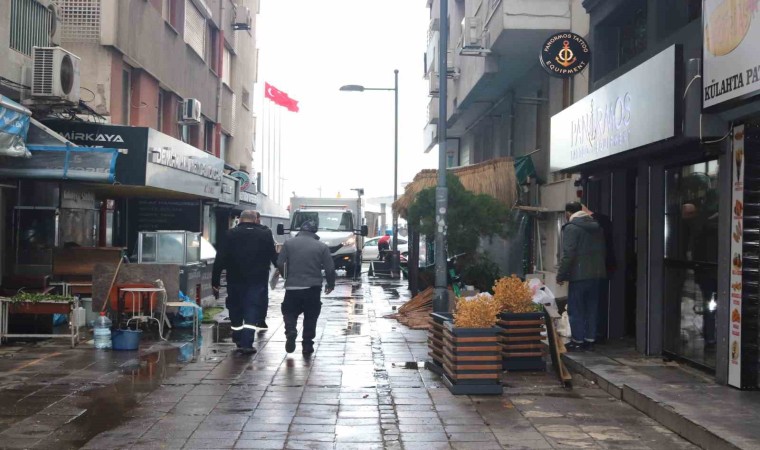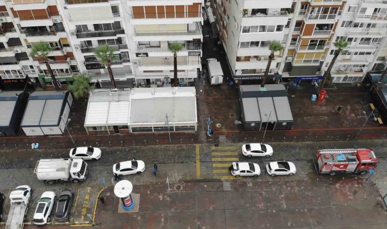 İzmir’de etkisini gösteren şiddetli yağış ve fırtınanın ardından denizin taşmasıyla birçok ev ve iş yerini su bastı. Su baskınlarından en çok etkilenen yerlerden Kordon’da esnaf, normale dönmek için çalışmalara başladı.
