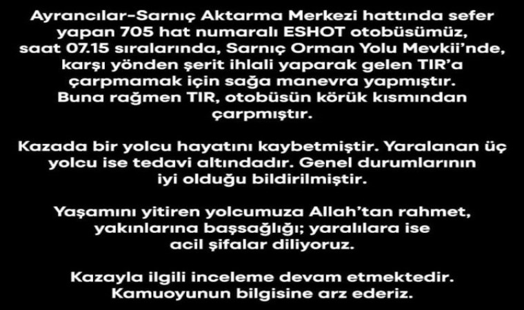İzmir Büyükşehir Belediyesi tarafından sosyal medyada kazayla ilgili yapılan açıklamada, “Ayrancılar-Sarnıç Aktarma Merkezi hattında sefer yapan 705 hat numaralı ESHOT otobüsümüz, saat 07.15 sıralarında, Sarnıç Orman Yolu Mevkii’nde, karşı yönden şerit ihlali yaparak gelen tıra çarpmamak için sağa manevra yapmıştır. Buna rağmen tır, otobüsün körük kısmından çarpmıştır. Kazada bir yolcu hayatını kaybetmiştir. Yaralanan üç yolcu ise tedavi altındadır. Genel durumlarının iyi olduğu bildirilmiştir. Yaşamını yitiren yolcumuza Allah’tan rahmet, yakınlarına başsağlığı; yaralılara ise acil şifalar diliyoruz. Kazayla ilgili inceleme devam etmektedir. Kamuoyunun bilgisine arz ederiz” ifadelerine yer verildi.