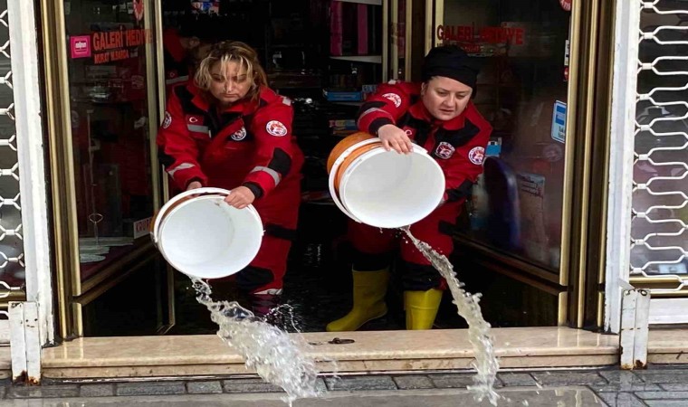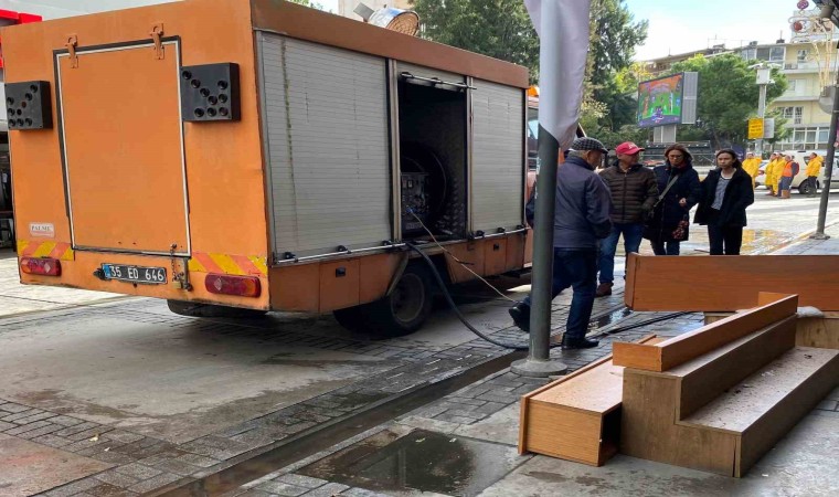 İzmir’de etkili olan yoğun yağışın ardından Kıbrıs Şehitleri Caddesi’ndeki esnaf, saatler sonra normale dönme çalışmalarına başladı.