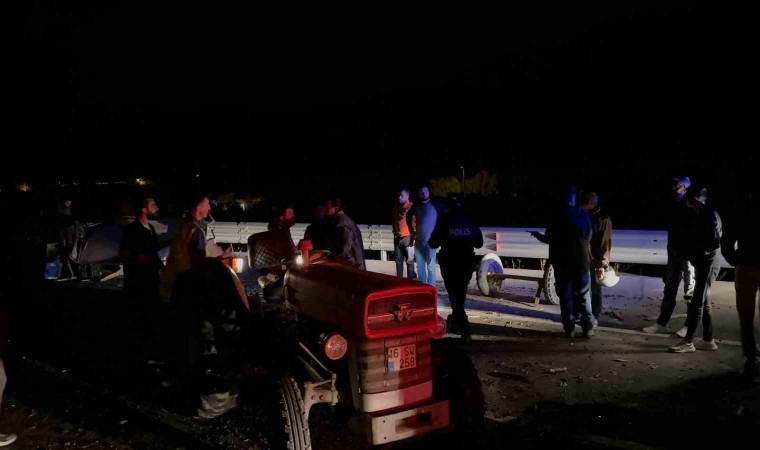 Bursa’nın İznik ilçesinde traktör ile çarpışan otomobilin metrelerce sürüklendiği kazada 1 kişi yaralandı. Çarpışmanın şiddetiyle traktörün römorkunda bulunan zeytinler yola saçıldı.