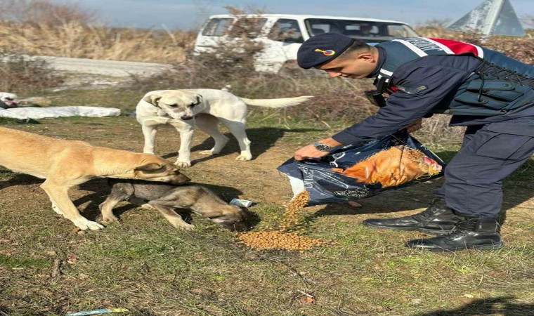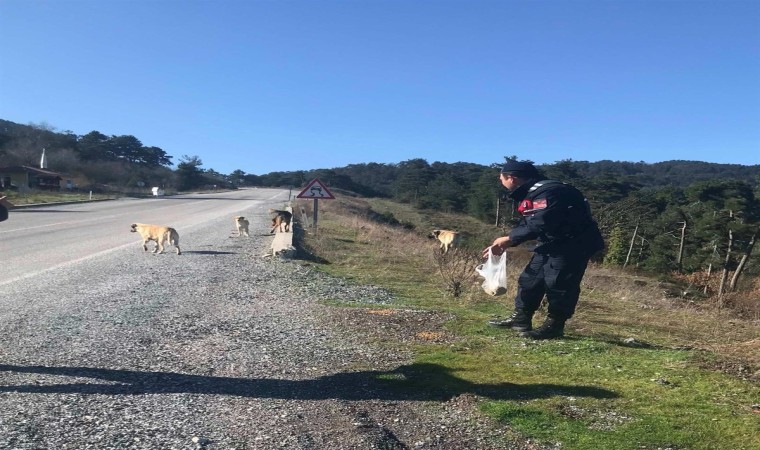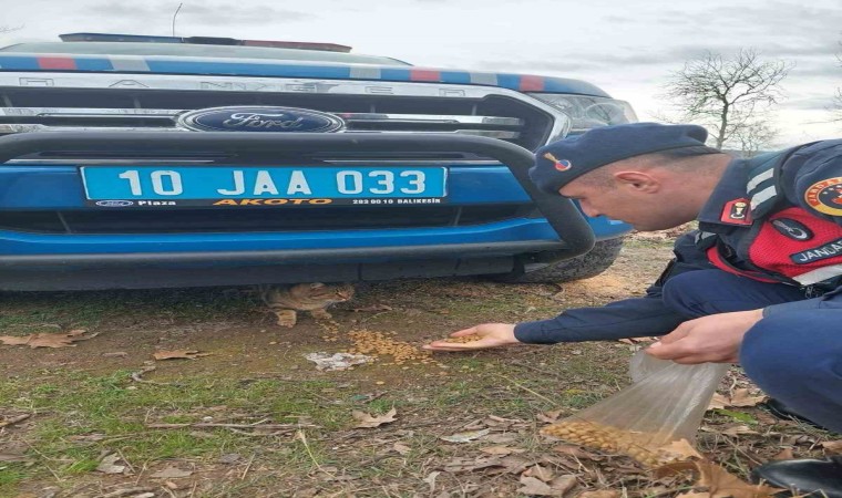 Balıkesir’de Jandarma ekipleri kırsal mahallelerde sokakta yaşayan ve soğuk hava şartlarında yiyecek ihtiyacını karşılayamayan sokak hayvanlarına sahip çıktı.