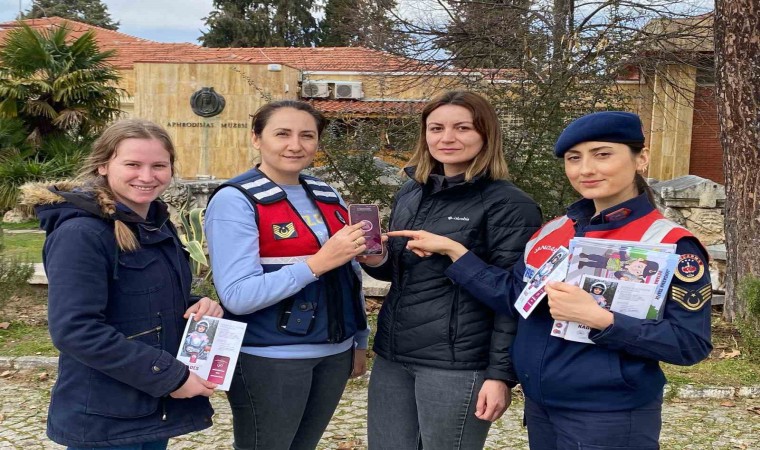 Aydın’ın Karacasu ilçesinde jandarma ekipleri yaptıkları çalışmalar ile Afrodisias Antik Kenti Müzesi’ni ziyaret eden vatandaşları çeşitli konularda bilgilendirerek farkındalık oluşturmak amacıyla broşür dağıttı.