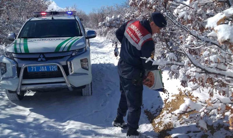 Kırıkkale İl Jandarma Komutanlığı ekipleri, çetin kış şartlarının yaşandığı yüksek rakımlı bölgelere ulaşarak yaban hayvanları için doğaya yem bıraktı.
