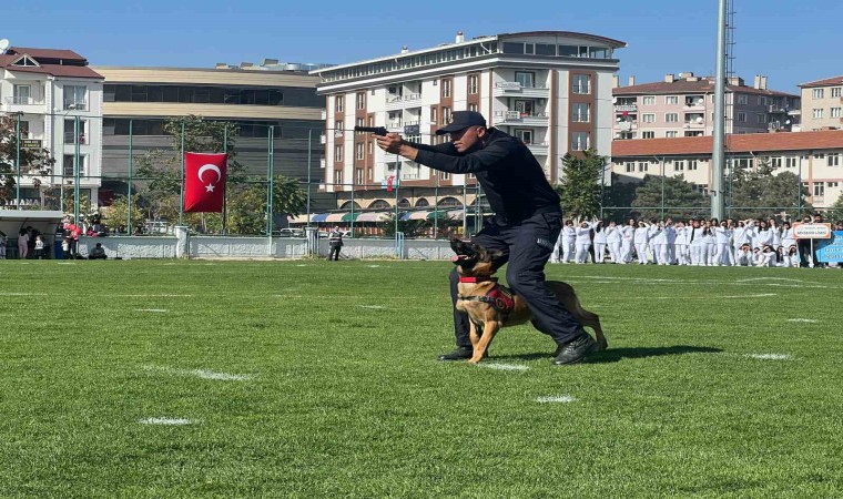 Cumhuriyet Bayramı’nın 100. yıl dönümü, Nevşehir’de coşkuyla kutlandı. Gençlik Spor İl Müdürlüğü çim sahasında gerçekleştirilen tören, Nevşehir Valisi Ali Fidan ve Nevşehir Belediye Başkanı Mehmet Savran’ın törene katılanların bayramını kutlaması ile başladı. Törende Nevşehir Gençlik Spor İl Müdürlüğüne bağlı halk oyunları, okçuluk, ve jimnastik sporcuları gösteri yaptı. Törende en çok alkışı alan ise Nevşehir JAKEM Komutanlığı’nnda eğitilen Nefes isimli köpek oldu. İlk olarak eğiticisi ile sahneye çıkan Nefes isimli Alman ırkı köpek, eğiticisinin tüm komutlarını eksiksiz yerine getirdi. Nefes bakıcısı ile ileri ve geri takip görevinin yanı sıra silahla ilerleme görevini icra etti. Eğiticisinin matematik sorularını da doğru bilen Nefes, mekik ve şınav da çekti. Gösteri sonunda ise esas duruşa geçerek protokol üyelerini selamladı. Nefes’in bu hareketi törene katılanlardan büyük alkış aldı.
