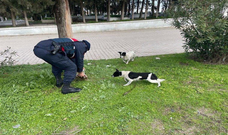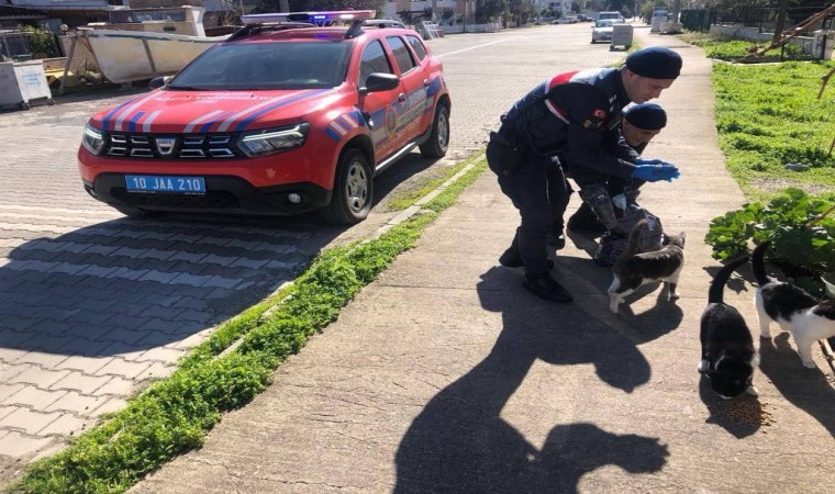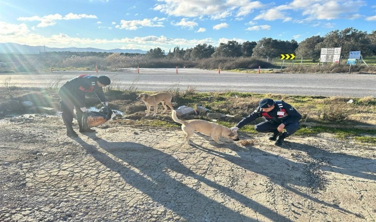 Balıkesir’de jandarma ekipleri soğuk hava şartlarında beslenme ihtiyacını karşılamakta zorluk yaşayan sokak hayvanlarına mama desteğinde bulunmaya devam ediyor.