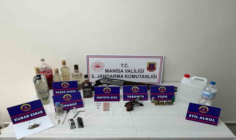 Manisa İl Jandarma Komutanlığınca bugün yapılan ’Türkiye kaçak-sahte alkollü içki uygulaması’ kapsamında, Alaşehir ilçesinde kaçak alkollü içki bulundurdukları bilgisi elde edilen 9 şahsa ait 13 adreste Alaşehir Cumhuriyet Başsavcılığı koordinesinde eş zamanlı operasyon yapıldı. Yapılan eş zamanlı aramalarda, piyasa değeri yaklaşık olarak 2 buçuk milyon TL olan, 1 adet damıtma makinesi, 1627 litre rakı, 1085 litre şarap, 265 litre etil alkol, 48 adet anason kiti, 56 litre viski, 20 litre votka, 14 adet sentetik ecza, 2.5 gram kubar esrar, 5 adet uyuşturucu madde kullanma aparatı, 1 adet kuru sıkı tabanca, 1 adet av tüfeği ele geçirildi.