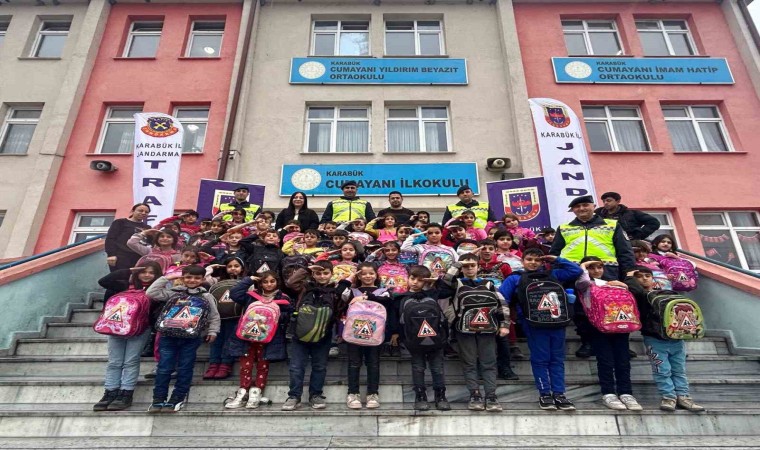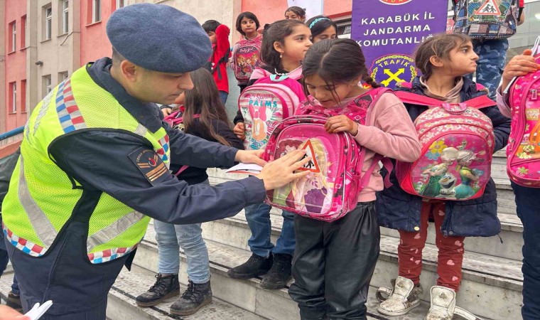 Jandarma ekipleri tarafından yol kullanıcılarında farkındalık oluşturmak maksadıyla öğrencilerin okul çantalarına reflektif özellikli etiket yapıştırıldı.