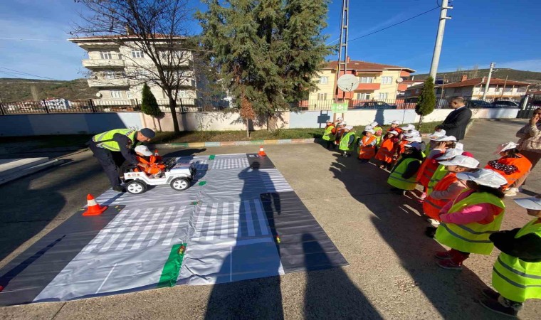 Gölpazarı İsmail Kara Anaokulu’ndaki öğretmen ve öğrenciye jandarma tarafından düzenlenen eğitime İlçe Kaymakamı Alparslan Sözen ve İlçe Milli Eğitim Müdürü Turgut Akagündüz katıldı. ’Eğitimde Trafik Işık ve İşaretleri’, ’Emniyet Kemeri Kullanımı’ konuları hakkında öğretmen ve öğrenciler bilgilendirilirken, branda trafik parkurunda akülü araba ile uygulamalı olarak faaliyet icra edildi.