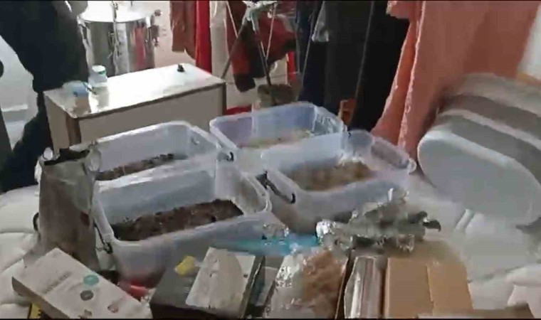 Yapılan aramada 18 adet kavanoz içerisinde 14 bin 400 gram LSD emdirilmiş tohum, 5 adet kavanoz içerisinde 2 bin 600 gram sıvılaştırılmış LSD, 4 adet kavanoz içerisinde 1130 gram olgunlaşmış sihirli mantar, 5 adet kavanoz içerisinde kurutulmaya hazır 3 bin 500 gram sihirli mantar, 25 adet LSD hap, 192 adet LSD emdirilmiş kullanıma hazır A4 kağıt, 32 gram LSD emdirilmiş kurabiye, 6 adet 30x15 cm boyutlarında saklama kaplarının içerisinde 36 kök sihirli mantar, 293 gram LSD emdirilmiş jel, elektrikli gıda kurutma cihazı, 3 adet hassas terazi, 2 adet kapsül dolum cihazı, 2 adet bitki üretim aparatı, 90 adet enjektör, 2 bin adet boş kapsül ele geçirildi.