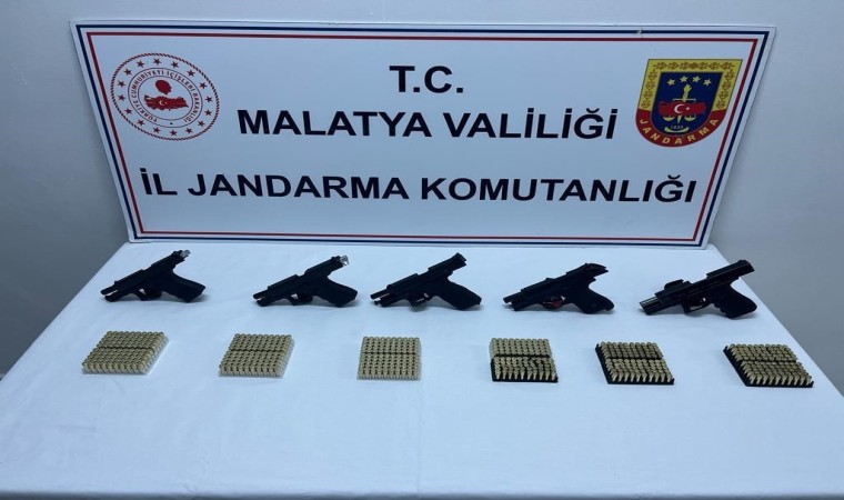 Malatya’da, İl Jandarma Komutanlığı’na bağlı ekipler tarafından silah kaçakçılarına yönelik operasyon düzenlendi. Kimliği belirlenen bir zanlı tarafından kent dışında şehre kaçak silah getirileceği bilgisi üzerine harekete geçen ekipler gözaltına alınan zanlının aracında ve ikametinde arama yaptı. Yapılan aramalarda 5 adet 9 mm çapında ruhsatsız tabanca, 6 adet şarjör, 376 adet 9 mm çapında tabanca fişeği, 250 adet 7,65 mm çapında tabanca fişeği ve 1 adet 7,62 mm çapında fişek ele geçirildi.