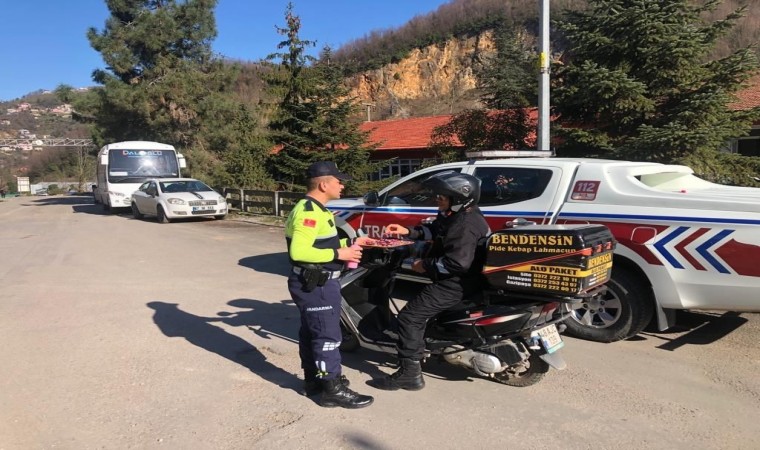 Zonguldak’ta jandarma ekipleri, sürücülerin Miraç Kandili’ni kutlayarak gül suyu ve şeker ikramında bulundu.
